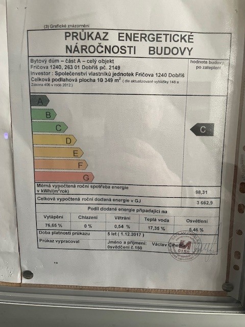 - Ukazatel energetické náročnosti budovy:98 kWh/m²
